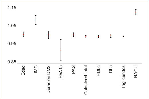 La asociación de las variables con el RCV muy alto mostraron una asociación significativa, la RACU 1.13 (RM: 1.13; IC 95%: 1.12-1.14; p < 0.00001), el IMC (RM: 1.09; IC 95%: 1.06-1.11; p < 0.00001) y la HbA1c (RM: 0.92; IC 95%: 0.86-0.98; p < 0.01) (Fig. 1).