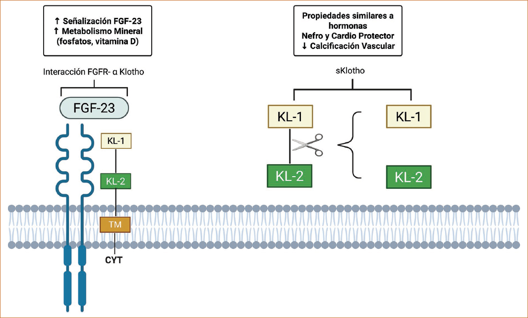 La proteína Klotho se expresa predominantemente en los túbulos contorneados distales del riñón, y en menor medida en otros tejidos como el cerebro, el páncreas, las glándulas paratiroides y los vasos sanguíneos humanos. Se presenta en dos formas: transmembrana (mKlotho) y sKlotho, ambas derivadas de α-Klotho, la subfamilia más estudiada de esta familia de proteínas40. La forma mKlotho funciona como correceptor del factor de crecimiento fibroblástico 23 (FGF23) y es esencial para el mantenimiento de la homeostasis del fosfato y el metabolismo de la vitamina D, mientras que sKlotho actúa como hormona circulante con funciones antiinflamatorias, antioxidantes y antifibróticas41.