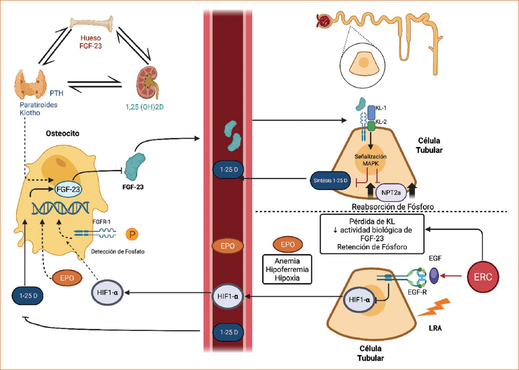 En el contexto de la ERC, diversos estudios han mostrado una reducción progresiva de la expresión de Klotho, correlacionada con una disminución de la tasa de filtración glomerular estimada (TFGe). Esta regulación negativa está impulsada por mecanismos tanto epigenéticos como no epigenéticos. La inflamación crónica, común en la ERC, inhibe la transcripción del gen de Klotho mediante la metilación de su promotor, la desacetilación de histonas y la acción de micro-ARN y ARN largos no codificantes. También contribuyen factores no epigenéticos, como el estrés del retículo endoplásmico y la degradación de proteínas intracelulares45. El FGF23 y Klotho desempeñan un papel primordial en la regulación mineral ósea, y sus alteraciones secundarias a las ERC, inhibiendo el TGF-β, el IGF-1, el factor nuclear kappa B y la Wnt/β-catenina46. El FGF23 es sintetizado por los osteocitos como una molécula de 251 aminoácidos. El cofactor Klotho es necesario para la unión de este receptor, lo que permite la reabsorción de fosfato en los túbulos proximales renales. El FGF23 regula la 1-α-hidroxilasa, el fosfato sérico y la PTH. En condiciones fisiológicas normales, el FGF23 circulante se une a los complejos del FGFR1–α-Klotho (KL) en la membrana basolateral de las células del túbulo proximal renal. Esta unión activa la cascada de señalización de MAPK, que involucra a ERK1 y ERK2, y conduce a la internalización y la degradación de NPT2a y NPT2c, lo que resulta en una disminución de la reabsorción urinaria de fosfato y su consiguiente pérdida. La señalización de FGF23 en el túbulo proximal también induce mecanismos posteriores que suprimen la transcripción de la vitamina D 1α-hidroxilasa (CYP27B1) y aumentan la transcripción de la vitamina D 24-hidroxilasa (CYP24A1)47. Debido a la relación directa con el FGF23, Klotho desencadena su principal acción: reducir la reabsorción de fosfato en los riñones. Su secreción por las células óseas se produce al aumentar la concentración de fosfato, desempeñando un papel importante en la homeostasis del fosfato al disminuir la reabsorción de este en los túbulos renales y aumentar su excreción48. Además, la expresión de Klotho se modula a través del FGF23, siendo Klotho un elemento esencial para la acción renal de FGF23. La expresión de Klotho disminuye conforme se reduce la TFGe, lo que altera la señalización de FGF2349. En las etapas tempranas de la ERC, el FGF23 incrementa la fosfaturia, previniendo la acumulación de fosfatos; este proceso requiere una correcta producción de Klotho, y por lo tanto su deficiencia conduce a un estado de resistencia a FGF23, causando daño orgánico al corazón, el endotelio y el hueso48. Varios estudios han demostrado que la excreción urinaria de proteína Klotho disminuye en las primeras etapas de la ERC50; los niveles séricos de Klotho son progresivamente más bajos a medida que se pierde la función renal, con una disminución media ajustada de 3,2 pg/ml por cada disminución de 1 ml/min/1,73 m2 de la TFGe51. Sin embargo, conforme hay progresión de la ERC, los niveles de FGF23 aumentan de manera exponencial, y la baja expresión y la falta de Klotho en el cuerpo limitan el efecto del FGF23 en la regulación del fósforo en sangre52. La relación entre FGF23, calcitriol y fósforo, dependiente de la presencia de Klotho como correceptor en el tùbulo renal, se resume en la figura 2, donde se resume su relevancia en la homestasis mineral en la ERC.Estudios recientes destacan la existencia de una retroalimentación positiva entre el FGF23 y citocinas proinflamatorias como la IL-6, el TNFα y la proteìna C reactiva en los pacienes con ERC. Este circuito es relevante porque el FGF23, más allá de su función principal como regulador del fósforo producido por células óseas (osteocitos y osteoblastos), actúa formando un complejo ternario con un receptor de FGF y la proteína Klotho. La interacción con citocinas sugiere un vínculo importante entre la inflamación y el metabolismo mineral en la ERC. El hiperparatiroidismo secundario es una de las complicaciones metabólicas más comunes derivadas de la ERC. El FGF23 y la proteína Klotho son los factores cuyas concentraciones cambian más temprano en el desarrollo de hiperparatiroidismo secundario. Las principales y más peligrosas complicaciones de este involucran los sistemas esquelético y cardiovascular. El aumento de la PTH relacionado con la ERC puede estimular la secreción de FGF23 a través de Nurr1 (Nuclear receptor related 1 protein). En el hiperparatiroidismo, hipotéticamente, FGF23 quedaría suprimido, ya que la hipersecreción de PTH causaría hipofosfatemia y se eliminaría uno de los estímulos de secreción de FGF2353. La consecuencia del hiperparatiroidismo secundario es la aparición de trastornos minerales y óseos, que incluyen osteodistrofia renal y calcificaciones en los vasos sanguíneos que conducen a complicaciones cardiovasculares54. En un modelo experimental se observó una relación directa entre los niveles de Klotho y la rigidez arterial, y se ha demostrado que la presencia de Klotho tiene un impacto positivo contra la calcificación vascular previniendo la transformación de células vasculares a células similares a osteoblastos55. También se ha observado que Klotho ejerce un efecto cardioprotector directo, especialmente frente a la hipertrofia ventricular izquierda. En estudios con ratones hipomórficos para el gen de Klotho se vio que la deficiencia de esta proteína se asocia con mayor fibrosis miocárdica, hipertrofia ventricular izquierda y reducción de la fracción de eyección, especialmente en presencia de ERC. La administración exógena de Klotho soluble mejoró estos parámetros de disfunción miocárdica de manera independiente del fósforo, el FGF23, la presión arterial y el filtrado glomerular. El efecto cardioprotector de Klotho se vincula con la inhibición del ca