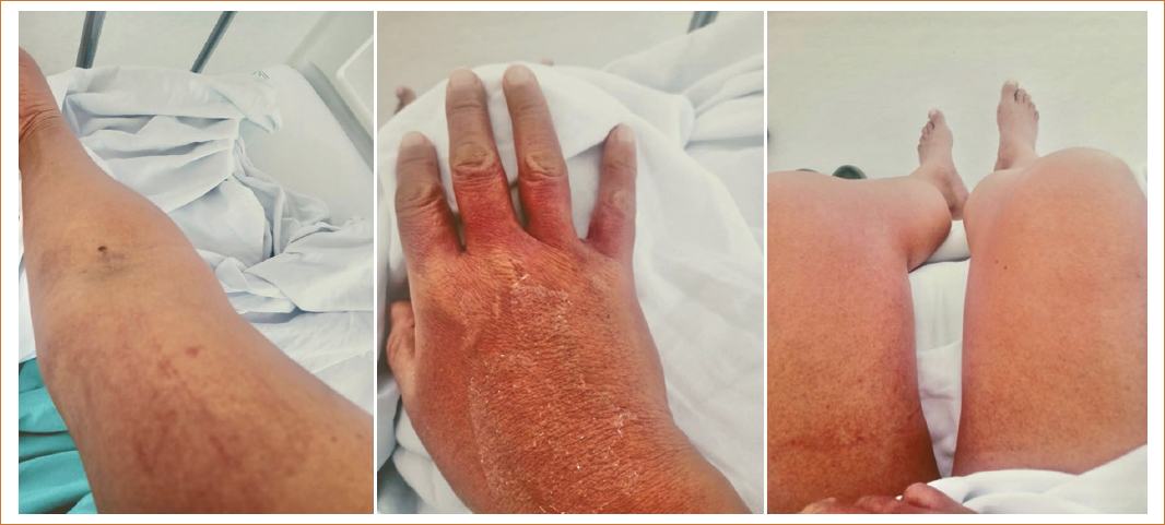 Figura 1. Manifestaciones dermatológicas: exantema rojizo intenso de predominio en las extremidades superiores e inferiores acompañado de prurito.