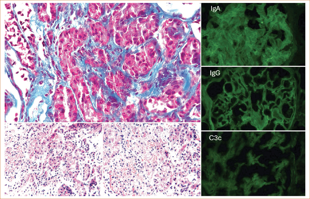 Figura 1. Biopsia renal con tinciones de hematoxilina y eosina, ácido peryódico de Schiff y tricrómico de Masson. Se observa un infiltrado intersticial linfocitario difuso con edema leve y daño tubular focal, caracterizado por pérdida del borde en cepillo y degeneración epitelial. Los glomérulos y los vasos se encuentran estructuralmente preservados, sin evidencia de proliferación ni de depósitos. En la inmunofluorescencia directa, las tinciones para IgG, IgA y C3c fueron negativas, lo que descartó una lesión mediada por inmunocomplejos.