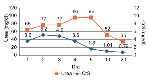Figura 2. Evolución diaria de la urea y de la creatinina sérica (CrS) entre los días 1 y 20. La urea muestra un ascenso hasta un pico en los días 4-5, con posterior descenso. La CrS desciende de forma progresiva hasta valores casi normales en el día 20.